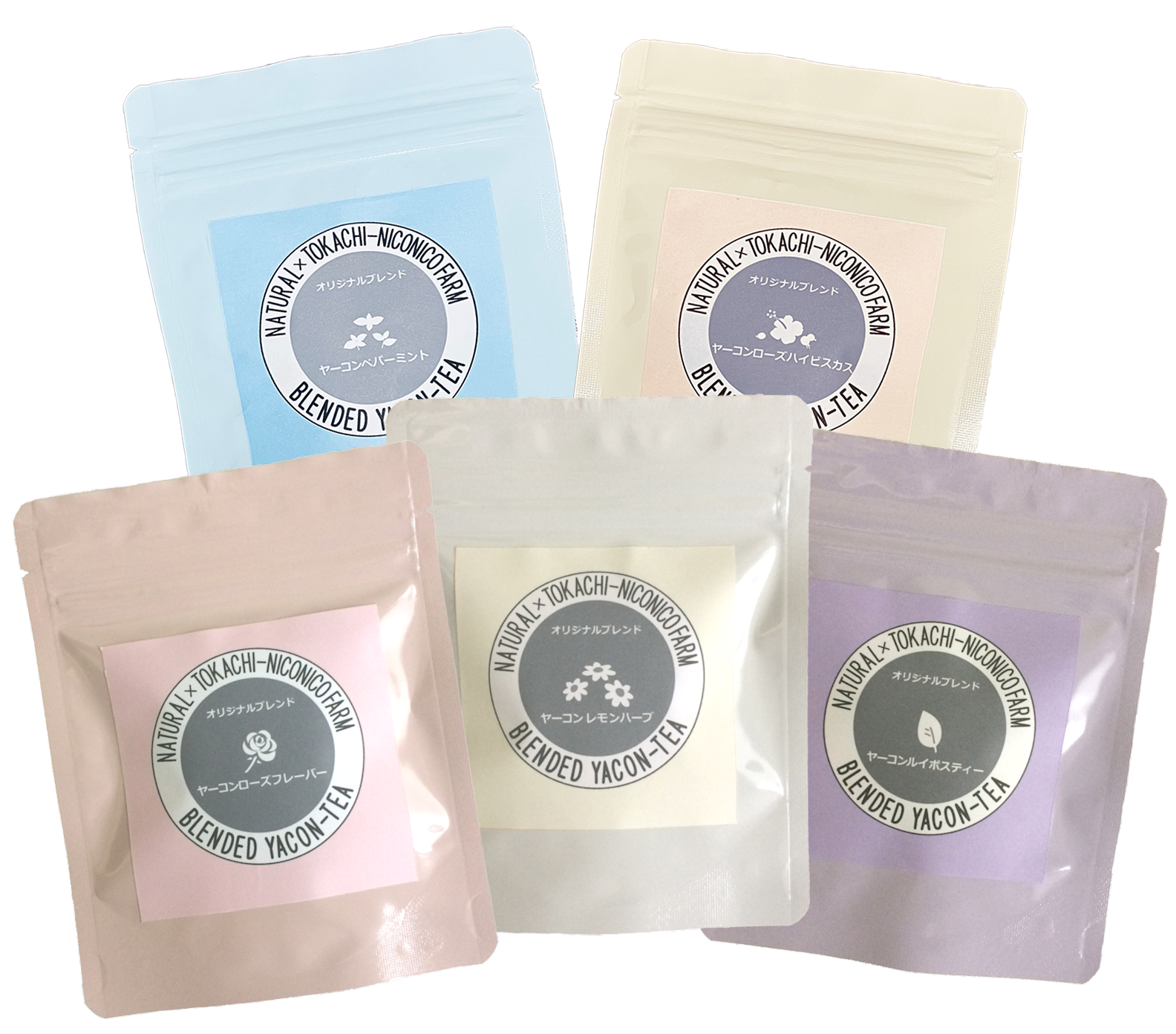 「ヤーコンローズフレーバー」、「ヤーコンレモンハーブ」、「ヤーコンルイボスティー」、「ヤーコンローズハイビスカス」、「ヤーコンぺパーミント」のオリジナルブレンドティー5種類がセットになったお得な商品です。